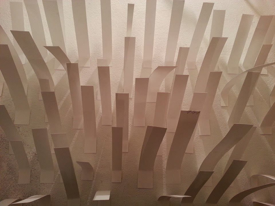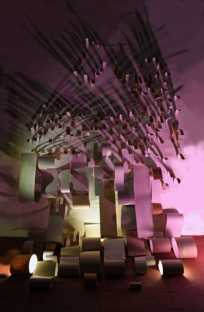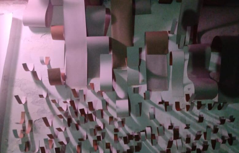 “Horror al Vacío, espanto por la nada, nada que la asociamos a pérdidas, a huecos, a carencias, a la falta de… entonces la intención de invadir nos urge, fantasmas que nos asustan, imperiosos, están ahí auxiliando para no sentir la soledad. Materialidad sometida a la disyuntiva, la tradición del Bendito Dibujo echada por el suelo, también por la pared, ya no dibujo sobre papel, dibujo con el papel, las sombras y la luz son mis elementos para trazar líneas, para crear, para decir y para hacer callar, para dibujar a mi manera. Hoy el horror a perder y a deshabitarnos, nos paraliza, hoy lo que alguna vez fue, ya no es más que un recuerdo, pero ahí está, de otra manera, con otra forma, diciendo algo, porque siempre dice algo, porque no existe el silencio en el arte.”