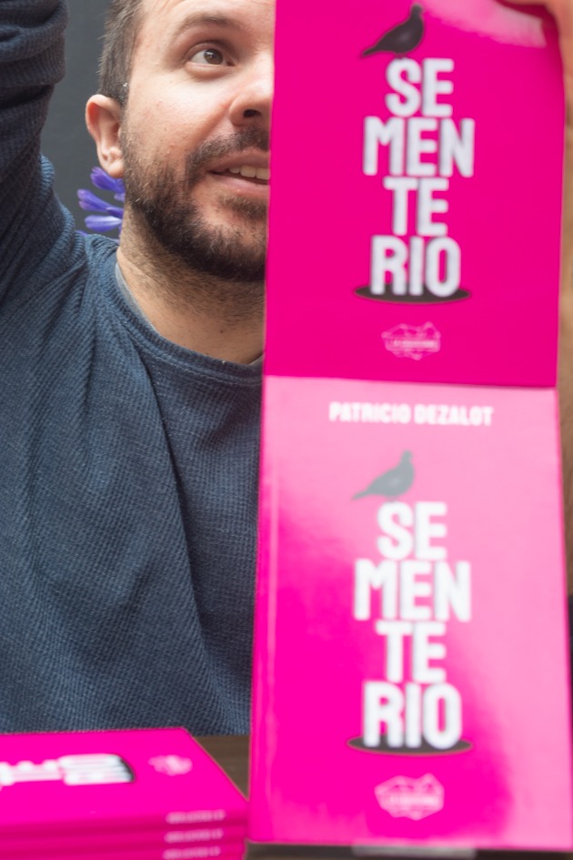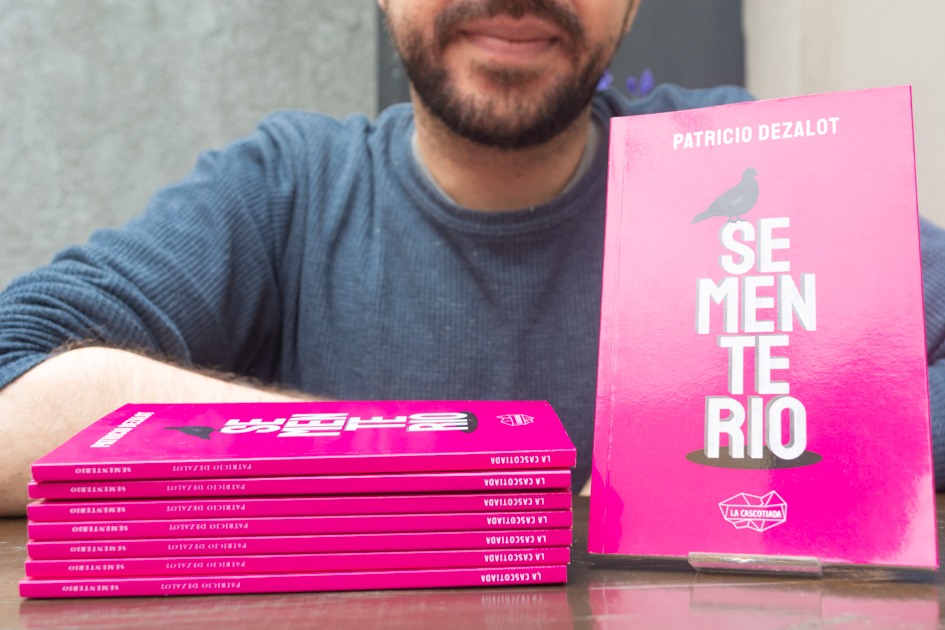 Patricio Dezalot es diseñador, historiador biográfico y archivista, ha trabajado en Gato Gordo Ediciones y actualmente es parte de la Cooperativa de Trabajo La Cascotida. Publicó Balcones, por María Perseveranda (Gato Gordo ed., 2015), Historia gráfica de las Marchas del Orgullo Tucumán 2013-2016 (La Cascotiada, 2020). Sementerio (La Cascotiada, 2023) es su primer libro de cuentos, que desde su título homenajea a Juan José Hernández, quién publicó Escritos IrreBerentes. Si quieren podemos encontrarle más sentidos a esa ese, por lo pronto anticipo que es el primer guiño del libro hacia Juanjo.
